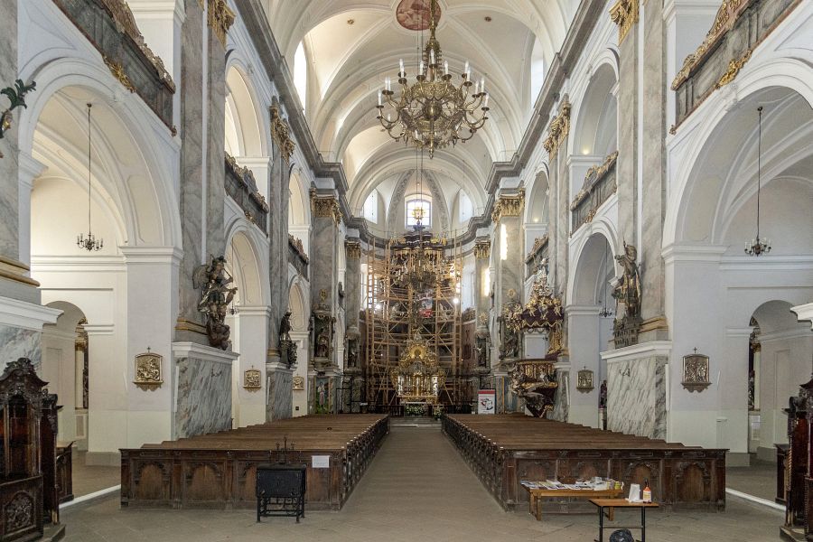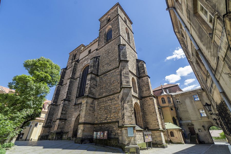 Kostel byl založen Arnoštem z Pardubic při starší svatyni johanitů v roce 1344, do konce 14. století zde pražská parléřovská huť vybudovala presbytář a boční kaple sv. Zikmunda a sv. Anny. Husitské války stavbu na dlouhých 30 let zastavily, a tak se v budování pokračovalo až za vlády Jiřího z Poděbrad po roce 1458. Do roku 1465 byla dokončena síťová klenba hlavní lodi a vystavěna jižní Bílá věž (na jejím nároží je uveden datum dokončení), sousední severní Černá věž (je o něco nižší) byla dokončena až v roce 1522. V letech 1500-01 byla v jižní stěně vystavěna nákladem minstrberského knížete Karla I. z Poděbrad kaple sv. Jakuba, ve které se dochovaly fragmenty gotické nástěnné malby (včetně českého erbu a erbu pánů z Poděbrad) a vzácná dřevořezba tzv. Madony s čížkem z roku 1360, dílo pražské parléřovské dílny, spojované s donací Arnošta z Pardubic. V roce 1624 převzali péči nad kostelem jezuité (jsou zde dodnes), kteří ho nechali částečně zbarokizovat. Byla položena nová dlažba, kaple sv. Anny změněna na kapli zemřelých, zvýšeny boční lodě a gotickou klenbu ozdobila výrazná štukatura. V roce 1717 vytvořil zpovědnici a kazatelnu významný místní řezbář Michal Klahr starší, varhany od pražského varhaníka Antonína Streita byly pořízeny v roce 1723 a hlavní oltář je z let 1727-29 od řezbáře Johanna Albrechta Siegwitze podle návrhu jezuity Kryštofa Tauše. Uprostřed lodi je v dlažbě před hlavním oltářem bílá mramorová deska nad hrobem prvního pražského arcibiskupa Arnošta z Pardubic (ⴕ 1363), původní gotická tumba s vápencovou sochou ležícího arcibiskupa, dílo parléřovské dílny z roku 1364, byla v roce 1964 přesunuta do severní boční lodi. Náhradou za to byla u posledního sloupu hlavní lodi umístěna klečící Arnoštova figura z bílého mramoru, kterou roku 1864 vytvořil sochař Jan Janda. Kostel je dnes významnou památkou pražského vrcholného a pozdně gotického stavitelství.