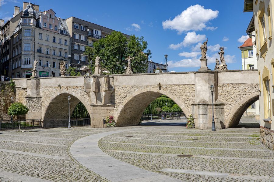 Ulicí Víta Stosse (ulica Wita Stwosza) v jihovýchodním nároží Rynku sestupujeme k asi největší zajímavosti Kladska, kterou je gotický kamenný most přes Mlýnovku (Most gotycki na Młynówce), někdy také zvaný jako most sv. Jana (Most Św. Jana), honosící se přirovnáním jako zmenšenina Karlova mostu v Praze. A opravdu, slavný most přes Vltavu v lecčem připomíná, dokonce je opředen i stejnou pověstí o tom, že do malty byly přidávány vaječné bílky. Kdy byl most postavený, není zřejmé. Pověsti mu přisuzují vznik na konci 13. století (1281), pravděpodobnější je ale výstavba mezi léty 1376 až 1390. Vede z ostrova Písek přes Mlýnovku (Młynówka), která je jedním z ramen Kladské Nisy, a ve středověku byl důležitým místem na dálkové cestě vedoucí z Prahy do Vratislavi právě přes Kladsko. Dlouhý je 52,2 metru a vozovka je široká 4 metry, stejně jako v Praze i zdejší most původně uzavíraly na každém konci brány (Horní a Dolní brána, odstraněné při rozšiřování města v letech 1903-04). Balustrádu mostu zdobí 6 barokních soch (východní strana): sv. František Xaverský z roku 1714, sousoší Ukřižování Krista se sochou Marie Magdalény z roku 1734, sousoší sv. Trojice korunující pannu Marii z roku 1714 a (západní strana): sv. Václav (1715), Pieta z roku 1655 na místě zaniklé mostní kaple a sv. Jan Nepomucký (1705, 25 let před jeho svatořečením), přímo inspirovaný slavnou sochou od F. M. Brokofa na Karlově mostě v Praze.