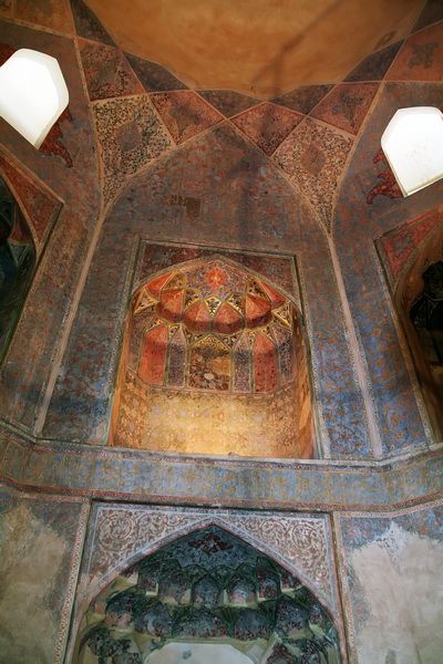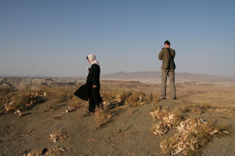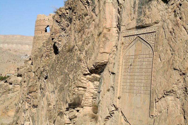 A protože Parvíz byl borec, za dvě hodiny s námi do Kalátu opravdu dojel. Bylo to sice „jen“ 150 kilometrů, ale samými vysokými horami, kde jedna zatáčka nad srázem přecházela do druhé a dokonce tam byly dva silniční tunely. Pokud to šlo, měl na tachometru rychlost 130 km/hodinu, takže jsme občas raději zavírali oči. O Kalátu jsme nikde nenašli žádné informace, a to ani na internetu. Nezmiňuje se o něm žádný průvodce a přesto je to nádherné místo. Ačkoliv Parvíz vůbec neuměl anglicky, věděl co chceme vidět. Dovezl nás přímo ke Slunečnímu paláci, jak se jmenuje nádherná stavba uprostřed městečka. Anglicky neuměl ani správce a tak dodnes nevíme, o jakou stavbu se jedná ani, z jaké je doby. Jediný údaj z roku 1740 se vázal k afšárovskému sultánovi Nádiru Šáhovi. V paláci je nádherný audienční sál a v podzemních katakombách expozice ze života lidí v okolí, doplněná scénkami s figurínami. Jako jsme nic nevěděli o Slunečním paláci, nic jsme nezjistili ani o sousední krásné mešitě, ani o zřícenině hradu v kaňonu za městem, pod kterým je ve skále vytesán nápis v arabštině.
