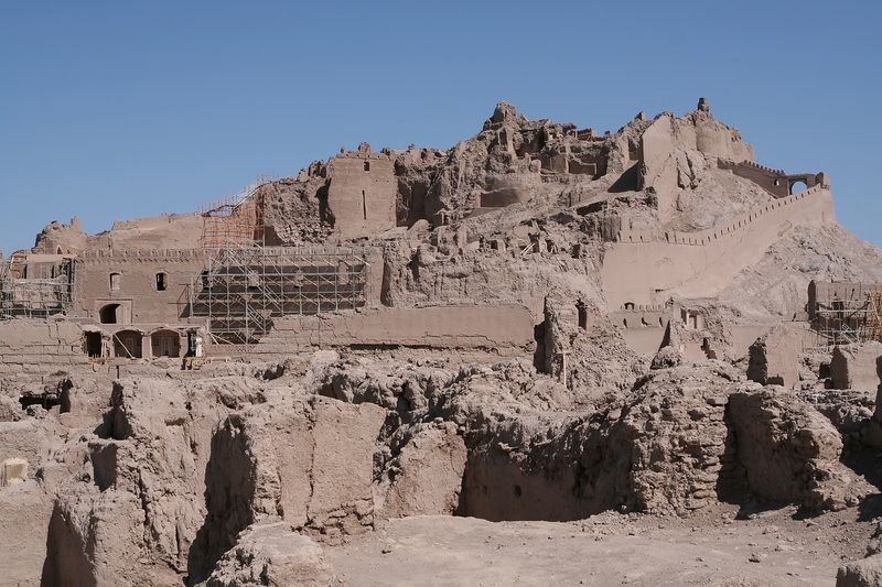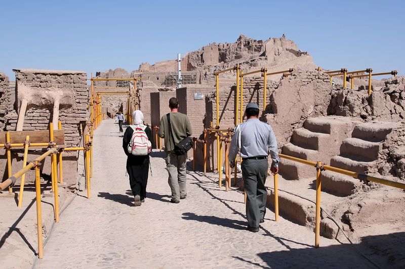 S naším průvodcem jsme prošli asi 300 metrů po vytýčené cestě pro návštěvníky, vedoucí hromadami hlíny a sutě, až na vyklizené bývalé náměstí pod citadelou. Dále se nesmí, cesta je přehrazena zábranami. Zpět jsme se vraceli se zvláštními pocity smutku a tísně, muselo to zde být před 4 lety příšerné. O mnoho lepší to není ani v novém městě, které z prachu pouště povstává poněkud rychleji. Není zde ale zatím žádná možnost ubytování (pro koho také) a mimo stánky s rychlým občerstvením jsme našli pouze jednu restauraci. Teplota dosahovala nepříjemných 32 °C, všude bylo hodně prachu, a protože zde již nebylo co k vidění, odjíždíme ve 12:30 hodin do dalšího cíle, města Jazd.