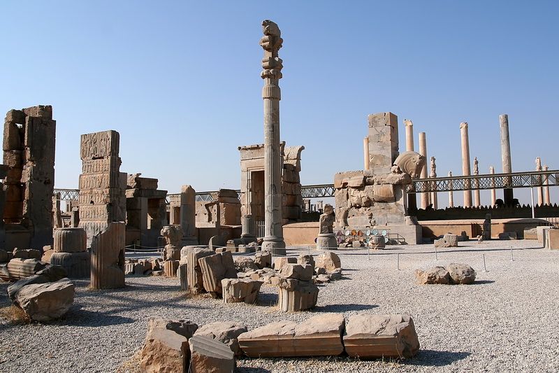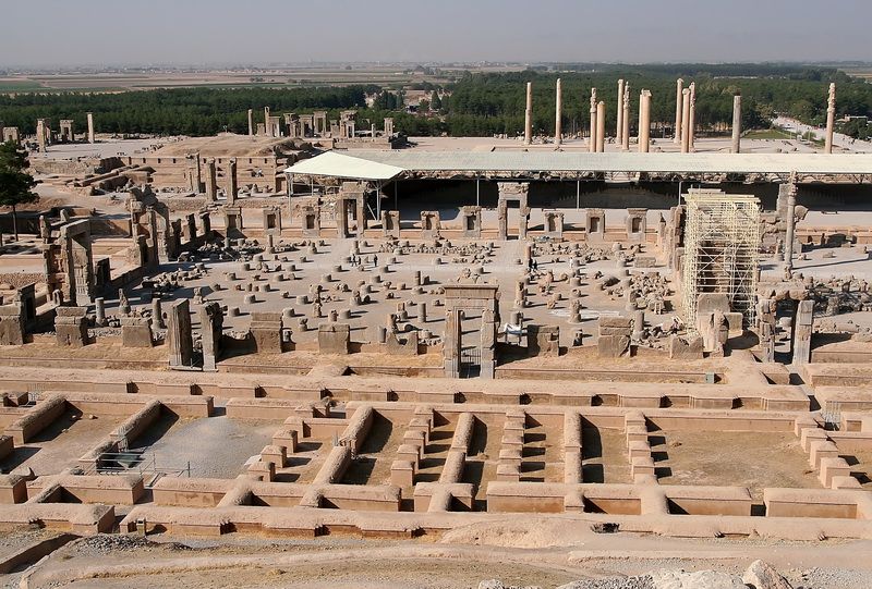 Když jsme vystoupali po mohutném schodišti na terasu, procházíme monumentální Bránou národů, kterou postavil král Xerxes. Bránu střeží zvláštní zvířata s tělem býka, křídly orla a hlavou vousatého člověka, nad nimi vidíme nápisy v klínovém písmu, na nichž sám Xerxes prohlašuje, že je mocným králem a že společně se svým otcem postavili tuto i mnoho dalších velkolepých staveb. Kolem několika kamenných soch koní si jdeme prohlédnout zbytky trůnního paláce Sto sloupů, jehož střechu podpíralo 10×10 sloupů vysokých 14 metrů, v rozestupu 7 metrů od sebe, což z něj činilo největší palác starověku. Do paláce se vstupovalo osmi branami, hlídanými kamennými býky. Obvodové zdi a části některých bran jsou opravené, aby si mohli návštěvníci udělat představu o jeho velikosti. Dnes stojíme před těmito zbytky v úžasu, jak si asi musely připadat delegace králů, které byly právě zde přijímány a zde skládaly přinesené dary. Na stěně je reliéf panovníka na trůnu, který podpírá 28 mužů, každý představuje jeden z porobených národů. Hned vedle paláce Sto sloupů jsou zbytky paláce Apadana, kde král vítal nejváženější delegace ve velkolepé přijímací síni. Z paláce se dochovaly obvodové zdi s reliéfem Průvodu provinciálů přinášejících dary, což je obrovský reliéf z tisíců postav, zvířat a zboží, vytvořený jako další důkaz panovníkovy moci. Představuje obyvatele celé říše v krojích a s typickými znaky jejich oděvů nebo rysů (čepice, účesy, zbraně, obuv), přičemž každé poselstvo tvoří 3 až 9 postav doplněných o přinášené dary. Nejkrásnější částí je severní schodiště do paláce, jehož ústředním motivem je symbol Ahura-Mazdy, zoroastrijského boha. Za Apadanou jsou dobře zachované paláce Dareia a Xerxe s masivními vstupními bránami, sloužící kdysi jako hodovní síně. Na jejích stěnách jsou další reliéfy, zpodobňující hrdinské činy králů, zápasy se zvířaty nebo obludami, alegorie zla a nepřátelských sil a nápisy klínovým písmem. Pozoruhodné je, že už tehdy měly oba paláce pod podlahou vybudovaný kanalizační systém. Nakonec jsme ještě vystoupali ke skalní hrobce krále Artaxerxe II., který byl pochován přímo nad městem. Od hrobky je nejhezčí pohled na celou Persepoli, s kterou jsme se tímto mohli rozloučit.