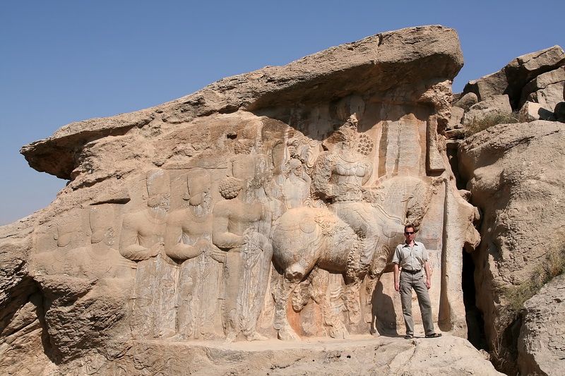 Po prohlídce, během níž na nás náš řidič počkal v družném rozhovoru s prodavačem vstupenek, se vydáváme na další cestu. Alí nám ale naznačoval a všelijak vysvětloval, že se zastavíme ještě na jednom památném místě, a to Nakš-é Radžab. Nic jsme o tom místě nevěděli a tak jsme souhlasili. Od skalních hrobek to bylo k tomuto místu asi jenom 2 kilometry. Jak jsme zjistili, jedná se veliké oslavné reliéfy sassánovských králů, které se skrývají za nenápadnou skalní rozsedlinou, hned vedle hlavní silnice ze Šírázu do Esfahánu.