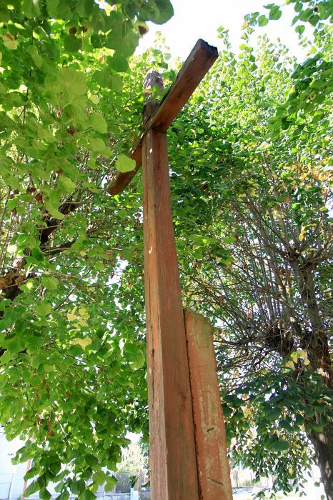 Dřevěný kříž nezjištěného stáří připevněný k betonovému sloupku.