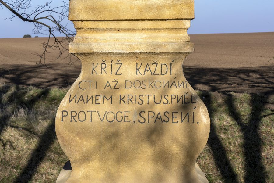 Na dvoustupňové pískovcové základně stojí zděný, bohatě konkávně a konvexně profilovaný sokl kvádrového tvaru, zdobený římsami. Kříž s postavou Krista na soklu je litinový a pochází až z konce 19. století. Na přední straně soklu je rustikálním písmem provedený český nápis, zvýrazněný černou barvou: KŘÍŽ KAŽDÍ CTI AŽ DOSKONANI NA NEM KRISTUS PMĚL PRO TVOGE SPASENI. Na zbylých stranách soklu jsou další fragmenty nápisů neznámého stáří, vlevo: V. K., vzadu: [---]A a vpravo: E[---] VOSEK.