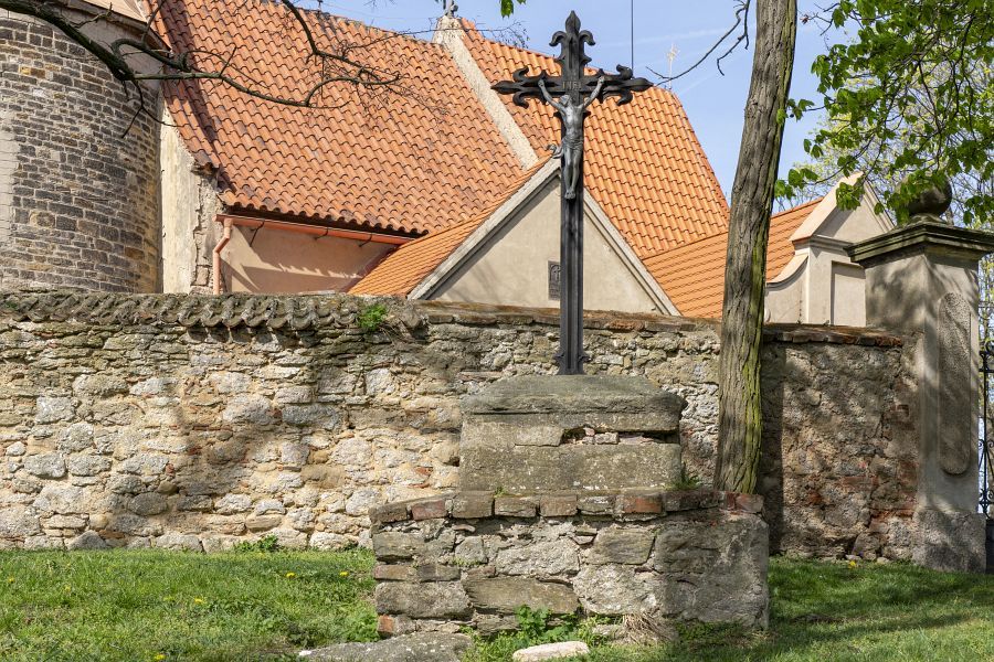 Křížek stojí na žulové skalce u hřbitovní zdi kostela sv. Jiří.