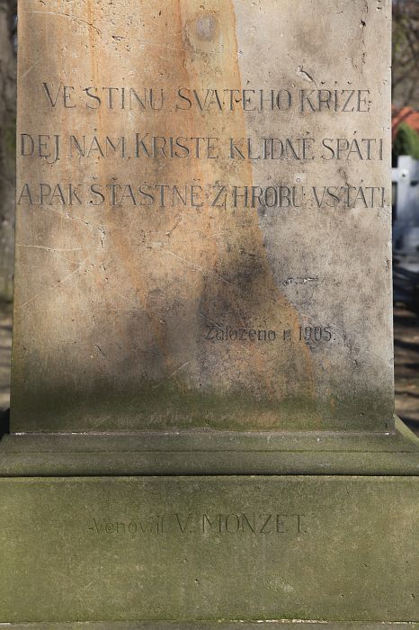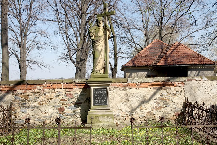 Kamenný kříž z roku 1905 zhotovený ze žlutého pískovce u příležitosti rozšíření hřbitova, zhotovil ho místní kameník B. Kramský na náklad V. Monzeta. Na soklu je nápis: VE STÍNU SVATÉHO KŘÍŽE DEJ NÁM KRISTE KLIDNĚ SPÁTI A PAK ŠŤASTNĚ Z HROBŮ VSTÁTI.
