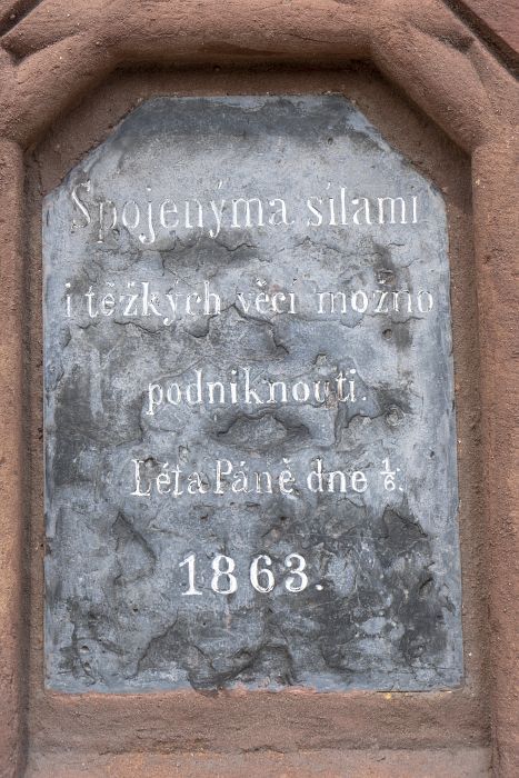Na přední straně je vsazena deska s nápisem: SPOJENÝMA SILAMI I TĚŽKÝCH VĚCÍ MOŽNO PODNIKNOUTI. LÉTA PÁNĚ DNE 1. 6. 1863.