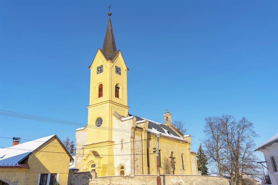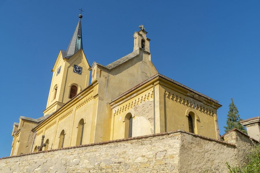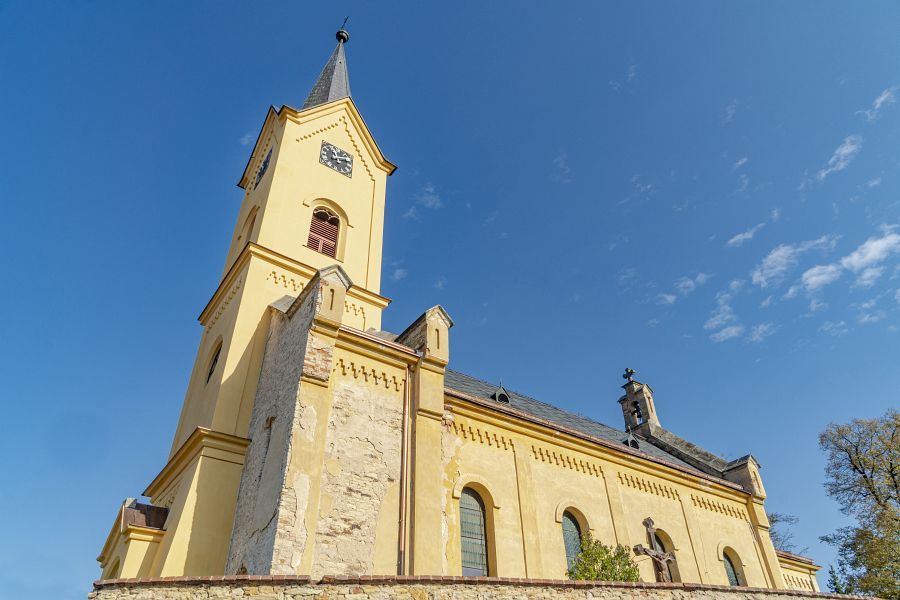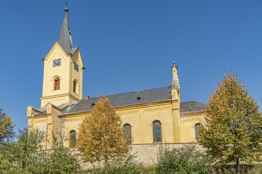 Původně středověký, zřejmě románský kostel z 1. pol. 13. století, o kterém pochází nejstarší písemná zmínka z roku 1309, vážící se k vysvěcení hlavního oltáře pražským biskupem Janem IV. z Dražic. V roce 1676 je kostel zmiňován jen jako kaple, která byla upravena barokně v roce 1787. V březnu roku 1864 byla z iniciativy faráře Františka Exnera ubourána loď kaple a ještě téhož roku byl k původnímu presbytáři přistavěn nový pseudorománský kostel podle návrhu šternberského stavitele Josefa Falty. Základní kámen byl položen 1. května a již 18. prosince byl slavnostně vysvěcen. V roce 1904 pak byl kostel důkladně opraven a na věž byly zavěšeny hodiny. V roce 2019 byla opravena fasáda věže a její střecha včetně nového krovu.