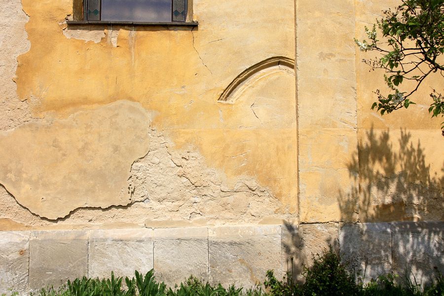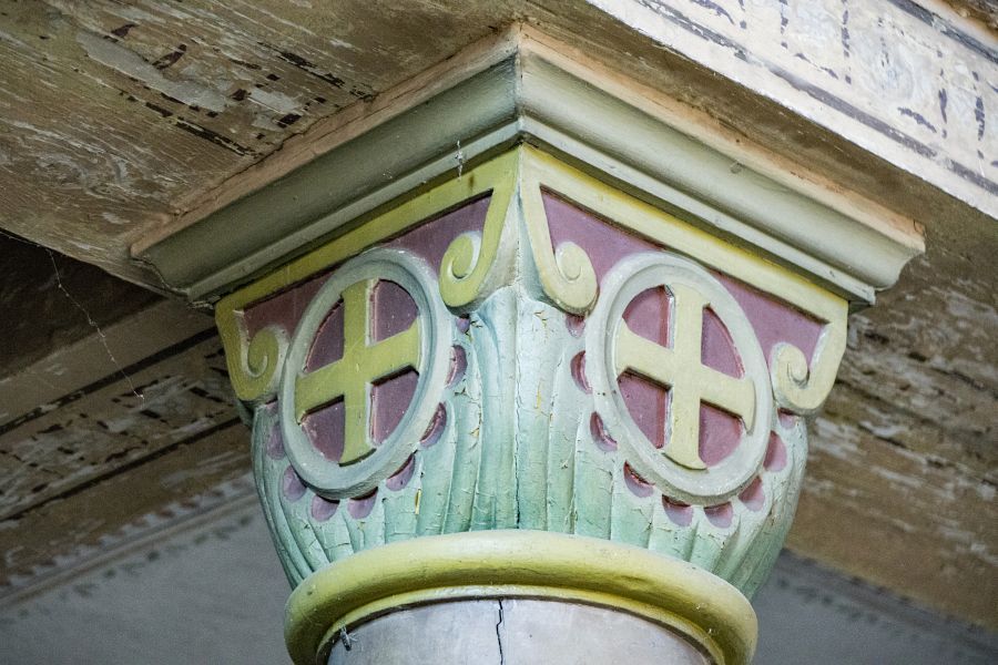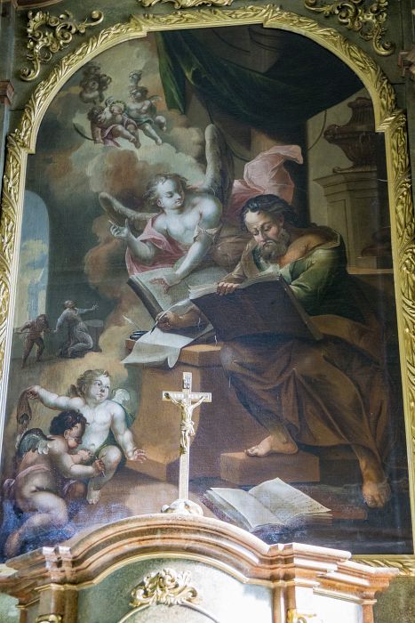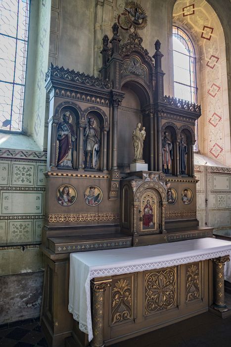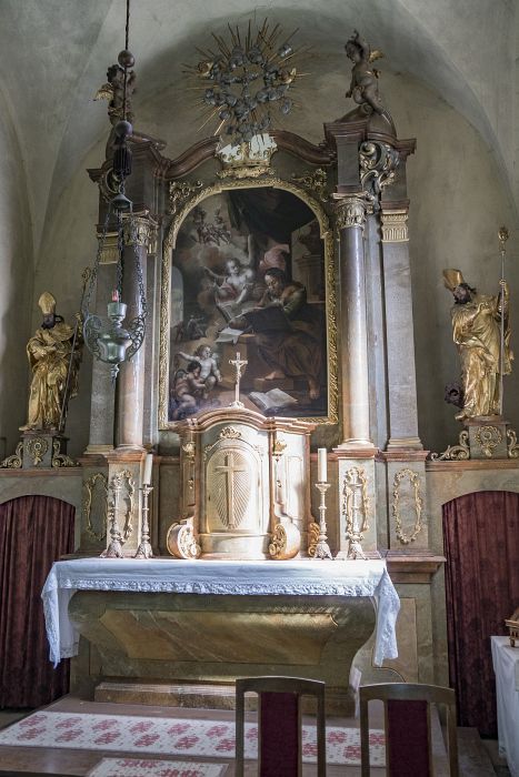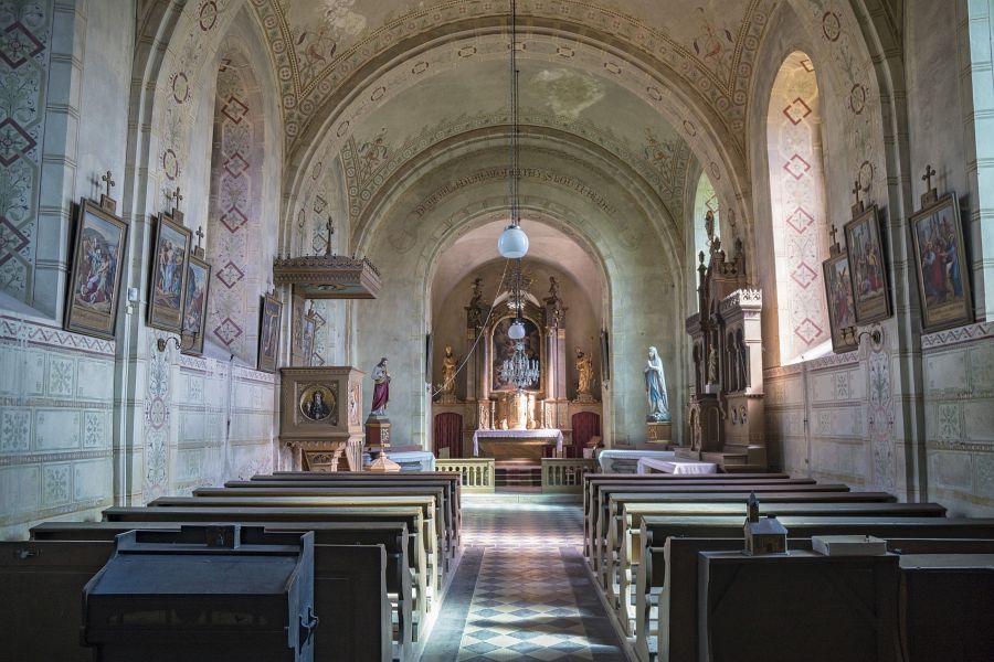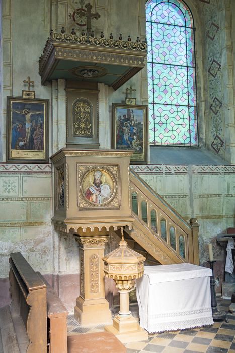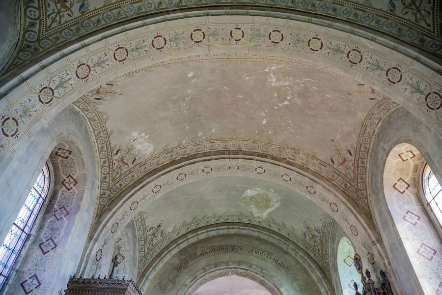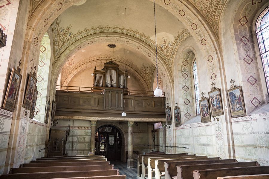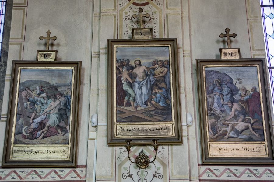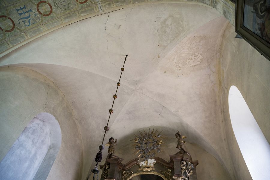 Presbytář je sklenut křížovou klenbou bez žeber, loď valeně do pásů. Na stěnách je plošně stylizovaná ornamentální a vegetativní výmalba s Nástroji Kristova umučení („Arma Christi“) na triumfálním oblouku.