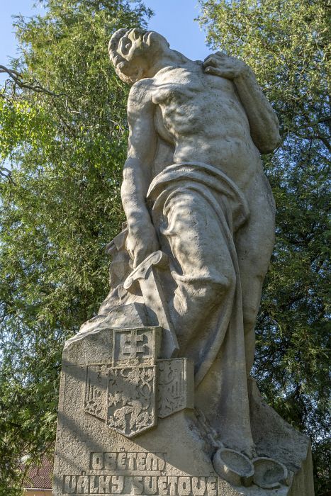 Základ celého monumentálního díla tvoří uměle zbudovaná vyvýšenina, ohrazená drátěným plůtkem, na které stojí dvakrát odstupněný obdélníkový sokl se schůdky, jehož horní část vytváří iluzi skály. Na jeho čelní straně, která je orientována k severu, je umístěn nápis: OBĚTEM VÁLKY SVĚTOVÉ 1914-1918, provedený stylizovaným secesním písmem, nad ním je umístěn reliéfně provedený znak českého státu a nad českým lvem je umístěn svatoštěpánský kříž. Na pravé straně podstavce se nachází nápis: Z VDĚČNOSTI A LÁSKY POSTAVILI SPOLUOBČANÉ LÉTA PÁNĚ 1925 a na jeho zadní straně pak nápis: NÁVRH PROF. SUCHOMELA. Sokl vrcholí sochou umírajícího hrdiny v podobě mladého muže, jehož tělo v záklonu, vytočené k pravé straně, je okovy připoutáno ke skále. Hrdina je zobrazen nahý, ve spodní části je jeho tělo zakryto draperií s harmonicky rytmizovanými paralelními záhyby, přepadávající přes jeho pravou nohu. V pravé ruce drží meč, levou ruku, v lokti zalomenou, si klade na prsa. Tělo je velkoryse expresivně propracované, zvláště v oblasti hrudníku a obličeje. Výraz tváře je útrpný, svědčící o bolesti, kterou muž prožívá. Socha byla vytvořena pro pohled ze všech stran, její zadní část je však z velké části překryta podstavcem, který je v této části plochý.