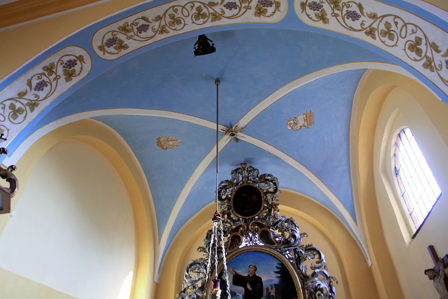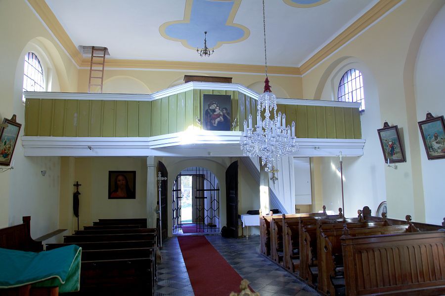 Velmi jednoduchou úpravu má i interiér kostela. Loď je plochostropá, ukončena obíhající římsou, stěny člení pouze slepé mělké arkády. Na západní straně je vestavěna dřevěná kruchta spočívající na dvou sloupcích. Presbytář je sklenut křížovou klenbou, stěny člení několik mělkých výklenků. Stejnou klenbou je sklenuta i sakristie. Strop lodi vymaloval místní malíř p. Věříš z Uhlířské Lhoty a zpodobnil na něm sv. Terezu v emblému kříže. Obnovu vnitřních maleb provedli v roce 2007 akademičtí malíři Petr Hampl a Jiří Miláček.