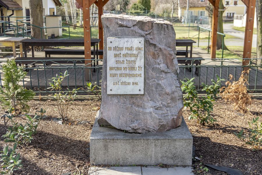 Památník je tvořen žulovou obdélníkovou základnou na které stojí hrubě opracovaný balvan z růžového kamene. Na jeho čelní stěně je připevněna deska z bílého marmoru s nápisem: NA VĚČNOU PAMĚŤ VŠEM / KDOŽ OBĚTOVALI / SVOJE ŽIVOTY / ABYCHOM MY MOHLI ŽÍT / NIKDY NEZAPOMENEME / KSČ VÍTĚZOV 1948.